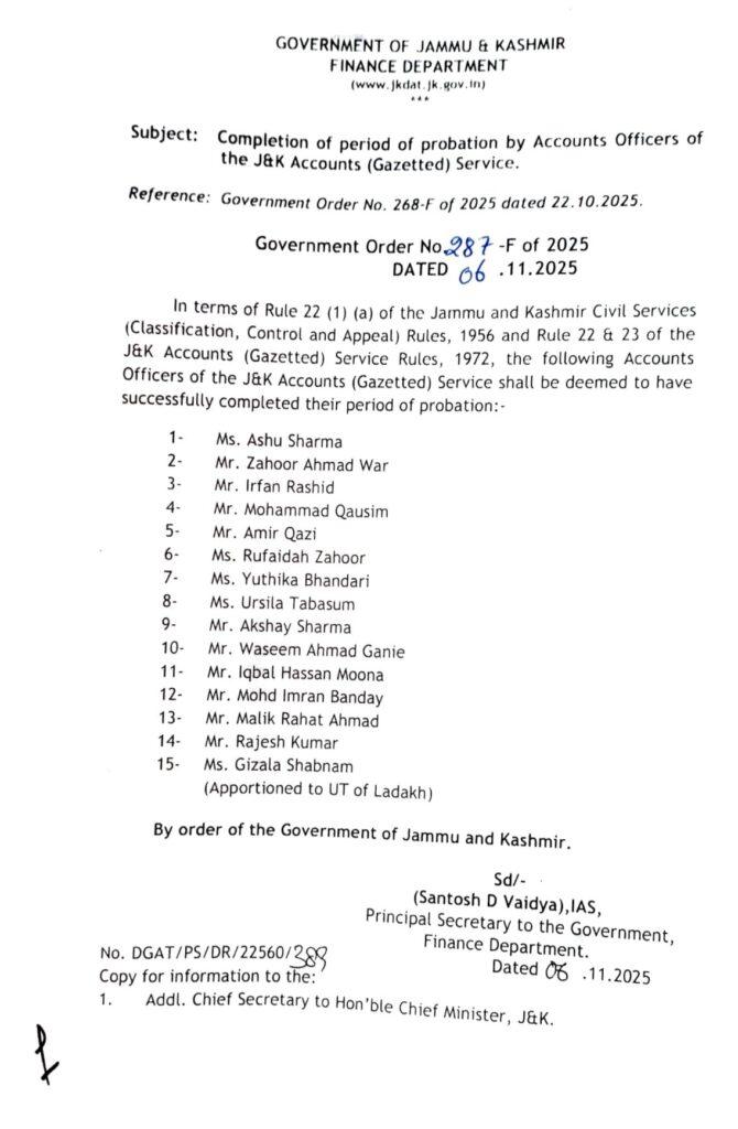 An order by J&K government read, “In terms of Rule 22 (1) (a) of the Jammu and Kashmir Civil Services (Classification, Control and Appeal) Rules, 1956 and Rule 22 & 23 of the J&K Accounts (Gazetted) Service Rules, 1972, the following Accounts Officers of the J&K Accounts (Gazetted) Service shall be deemed to have successfully completed their period of probation”:
