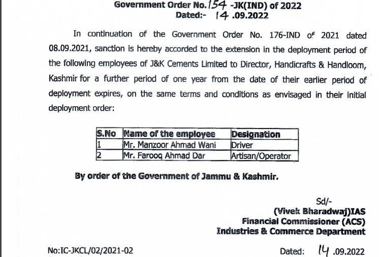 Jammu and Kashmir government ordered deployment of employees of J&K Cements Limited to Director, Handicrafts & Handloom, Kashmir