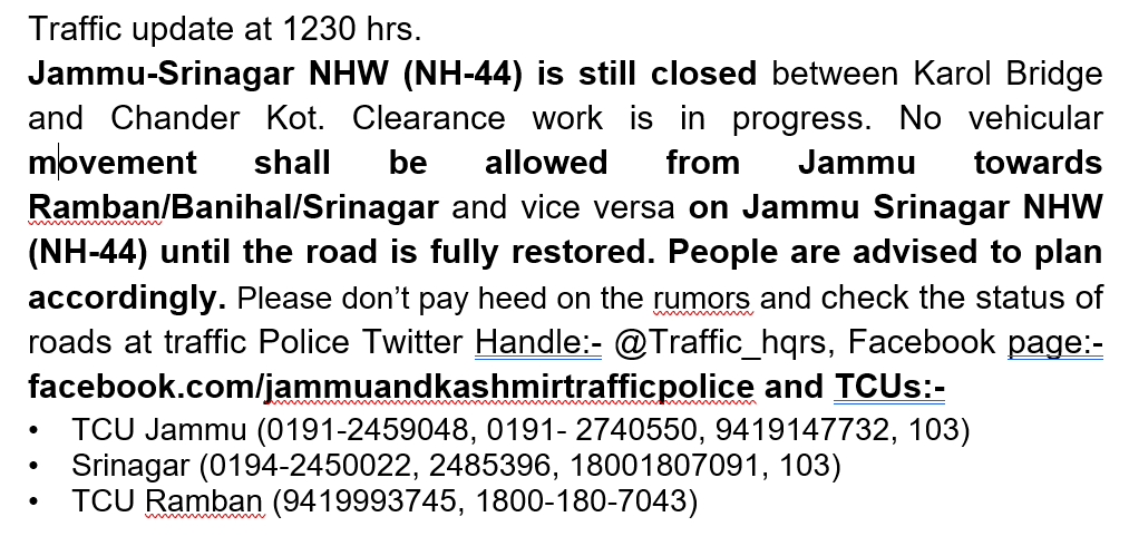 The traffic police has advised motorists not to undertake journey on the Jammu-Srinagar highway as the road is blocked due to landslides.